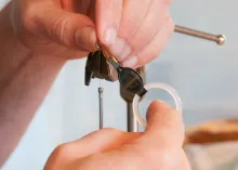 Get out a drill and drill through the "handle" of the clip. It typically has a hole in one side already, meant for an electrical plug. Once the hole goes all through, simply mount a key chain ring in the hole, et viola! You have a set of 1 dollar hackle pliers.
