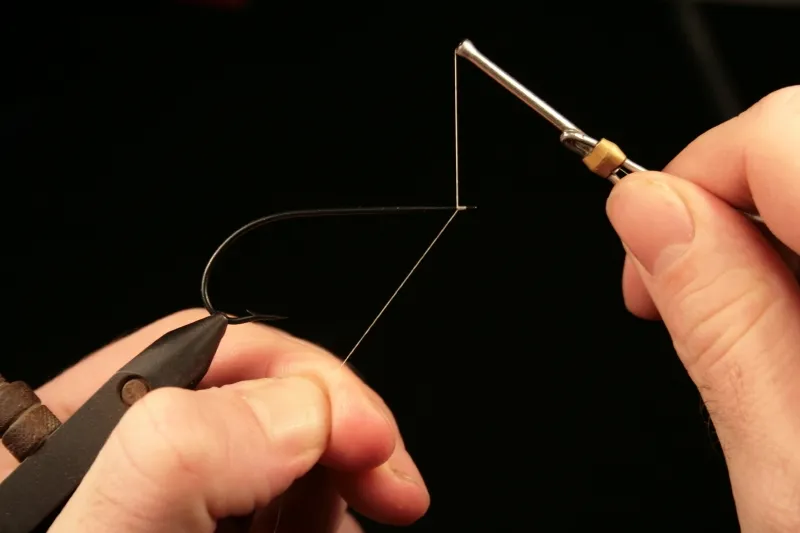 Attach the 8/0 thread at the front, if you don't cut off the end you can use it to make wraps close next to each other. Make a series of wraps backwards and then turn back towards the front to have a good foundation of tread for tying the gut-eye on.