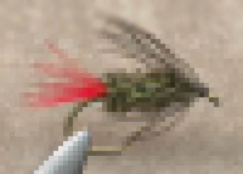 A simple to tie but very effective soft hackle pattern. The Gray Hackle Peacock has taken trout for me in a wide variety of circumstance. A grizzly hen saddle supplies the necessary hackle for the fly. Some folks will use red wool, floss, or other material for the tail, but I prefer the barbules of a bright red hackle. Note the sparseness of the hackle and the length of the barbules in relation to the hook shank.