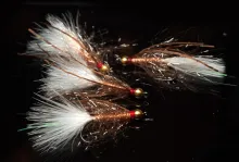The hallmarks of the original is the marabou or chickabou tail, the fairly fat body made from marabou dubbing and the short, spiky hackle. You dub over the eyes and use flash in the tail, body and head. It's tied quite large and the result can be a hefty and tempting morsel. The original was tied on a curved hook – an CS54 Salwater Shrimp hook from Partridge size 2-4.