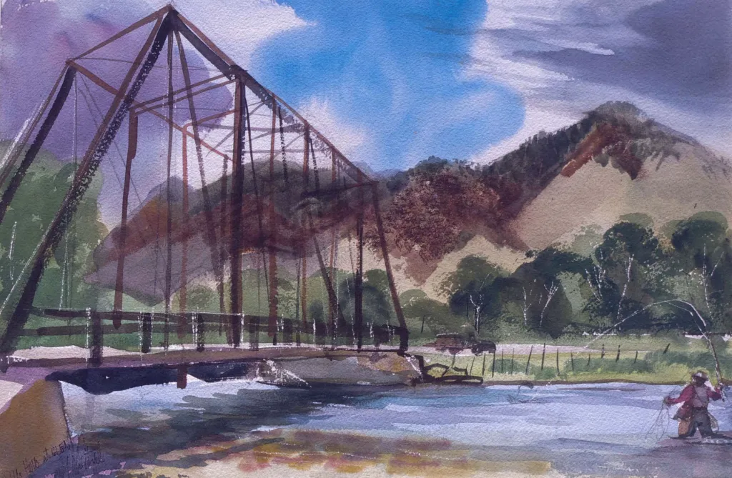 Title: Old Iron Bridge Pool on the Big Hole River at Melrose, Montana, Original Watercolor, size 14" by 20”.