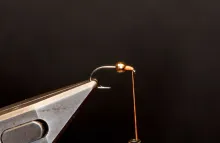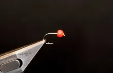 Beads or cones are a whole different game. Most beads and cones slip over the hook point up the shaft and sit close behind the hook eye. In order for them to be able to pass the barb and the hook bend, they mostly have oversize holes and many are even countersunk and some beads are slotted. That means that once they are in place, they are loose. A lot of tyers solve this with glue, and I often do the same thing, since beads are notoriously prone to moving down the hook shank in the cast if they don’t sit really well.